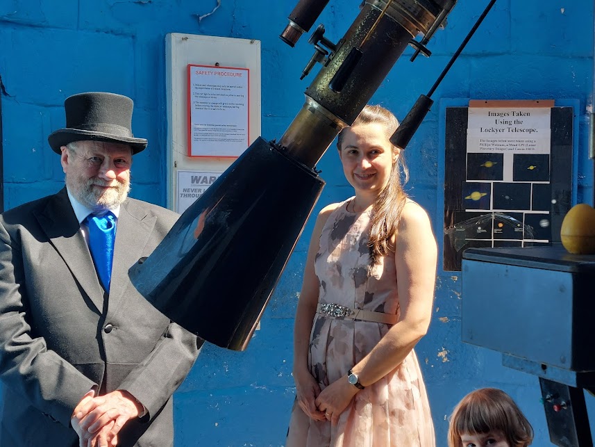 The sun shone and the people came to the Norman Lockyer Observatory for a delightful afternoon of music, ‘This is your life’ presentation, and cake. Member, Bill Hitchings, dressed magnifcently as Sir Norman, was treated to an overview of his life from ‘Eamon Andrews’ aka Jonathan Milford. Chairman, David Strange, had produced an excellent script taking Sir Norman on the journey of a lifetime, ending with a look at the scientific advances since 1920, and the uses of Sir Norman’s greatest discovery. Helium, from first being identified as a thin new line in the Sun’s spectrum is now widely used in MRI scanners.