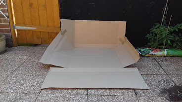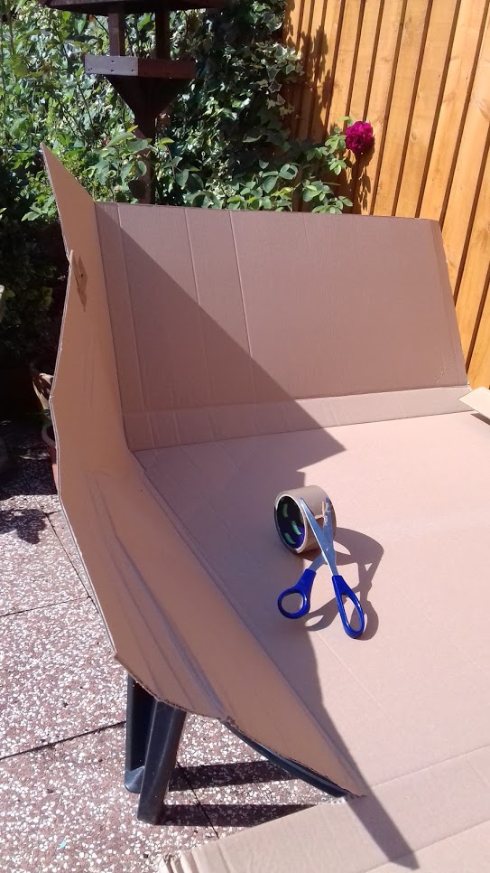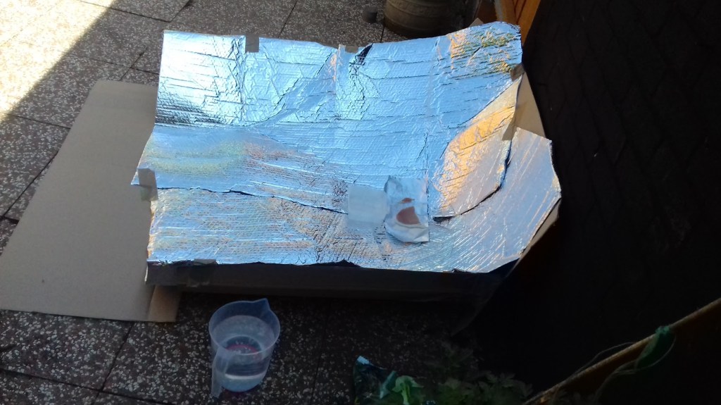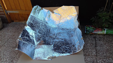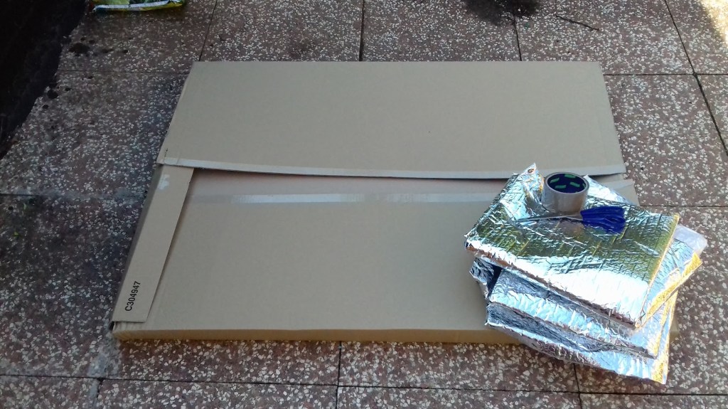 Step 3. Cover the cardboard with a reflective materials, such as foil or insulating material (I had some spare packaging…). Tape it all up so that the foil covering won’t get blown away.