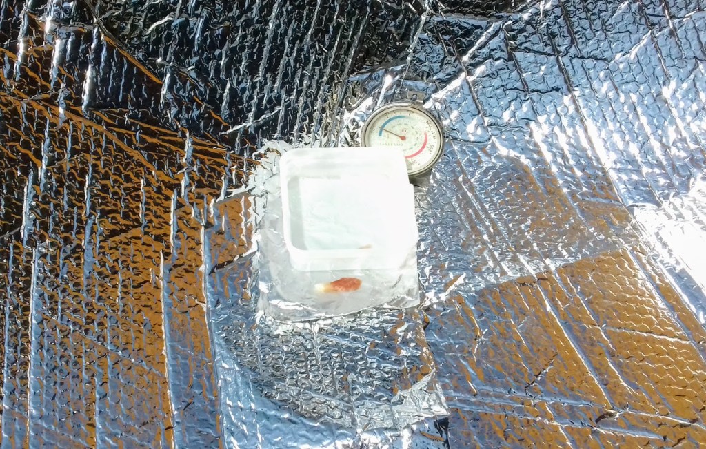 Result: the bacon had dried and showed signs of being cooked and the water felt warm. The temperature at the ‘sweet spot’ where all the light from the sun was being channelled was around 50 degrees Centigrade.